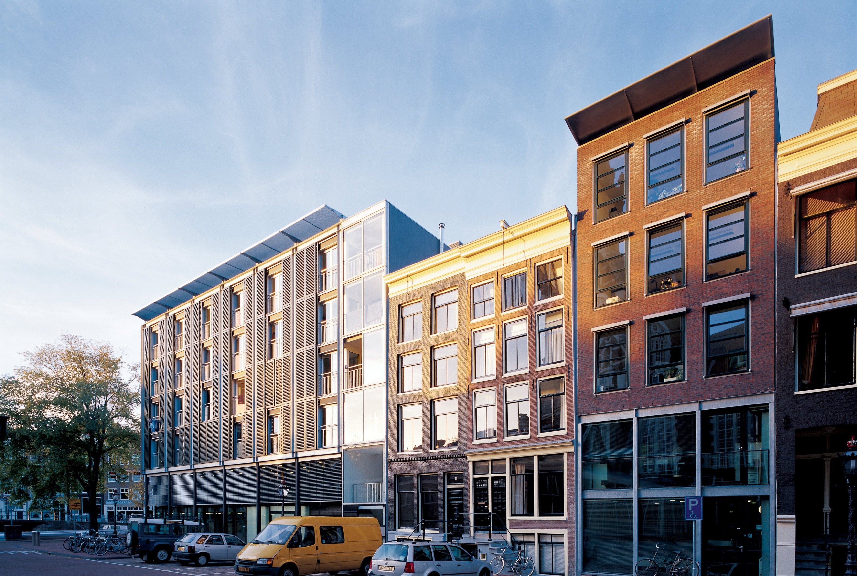 The apartments are oriented towards the church (Westerkerk) and the south, and separated from the offices by a long passage. Moveable shutters function as blinds, creating an ever changing, interesting façade.