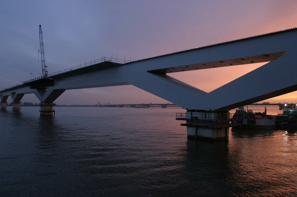The bridge lies between two existing bridges, one for regular trains, one for car traffic. From the car bridge the two train bridges can be seen in the distance, with the flowing arch of the new bridge slightly elevated above the older one. The new bridge is held aloft by a structure of open V-shaped piers whose positions exactly correspond to those of its neighbor, ensuring easy passage for the ships.