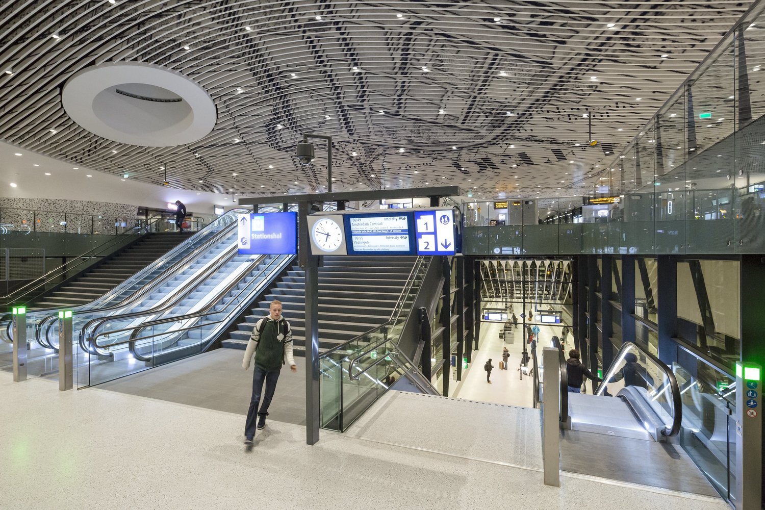Despite being underground, the station feels open, well-organized and safe thanks to the smart use of daylight. A mezzanine floor in the tall space of the station hall, the central access and the glass floor in front of the entrance all bring daylight down to the platform level. A special ceiling determines the atmosphere below: four meters above the platform it consists of shiny, slender aluminum panels that follow the direction of the train tracks, naturally leading travellers towards the stairs and daylight.